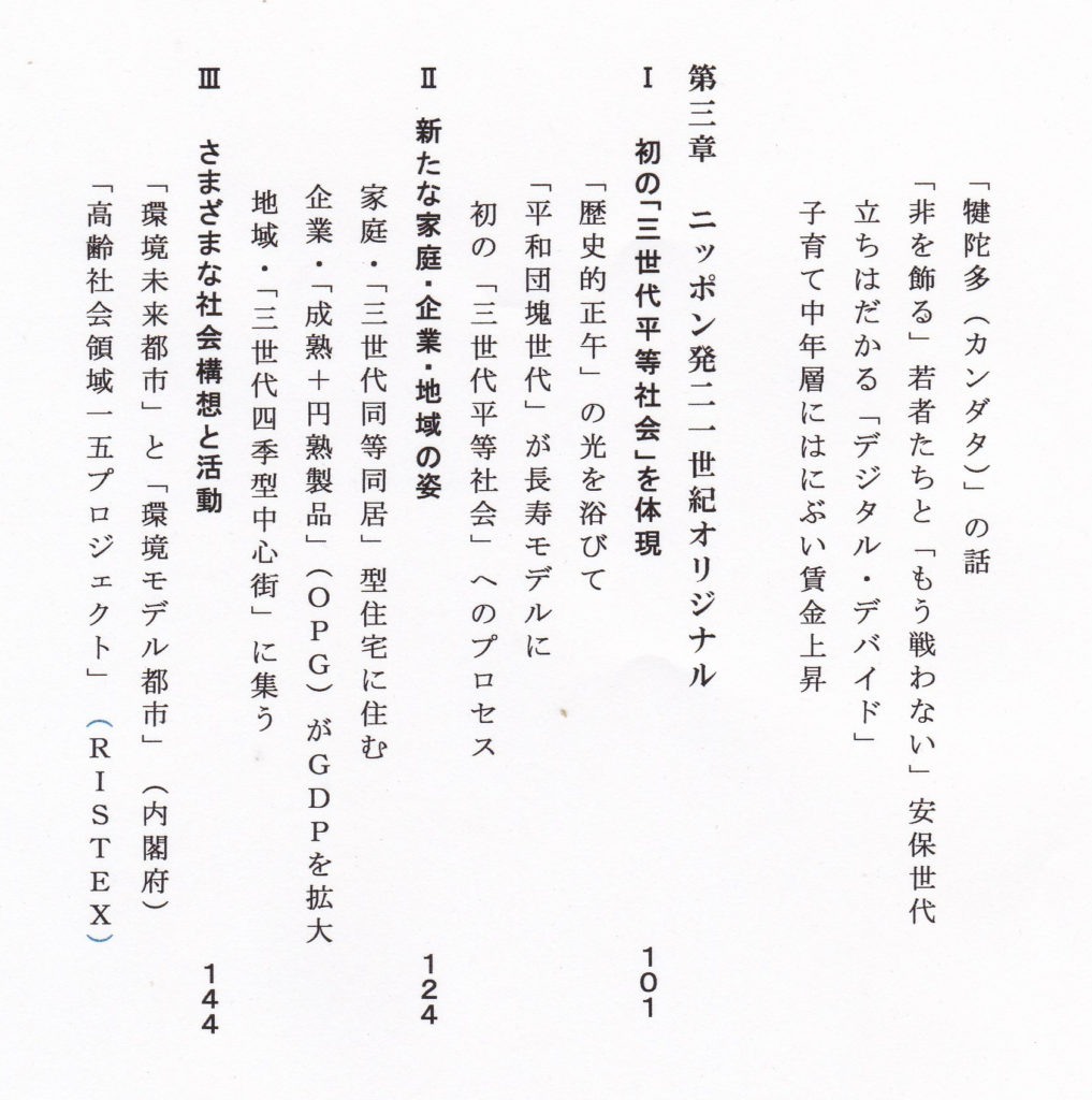 わが国の政府が「高齢化社会」への対応を「ゴムひも伸ばし」に続けてきたゆえに、天皇みずからが新たな生き方で新たな人生と社会づくりに臨まれることになる。ここで広く「青少年世代」(~30)、「中年世代」(~60)とともに、史上に初の「高年世代」(~90+)が意識されて、生前退位された天皇の生涯とともに新たな時代(社会)を三世代が平等に形成することになる。 「シニア用語」としては、この状況を高齢者層による「三世代平等化」の契機として捉えて、これを「後平成期」の「三世代平等化」と呼んで、高年期を迎えて「百齢長寿」をめざす人びとの積極的な社会参加を呼びかける。